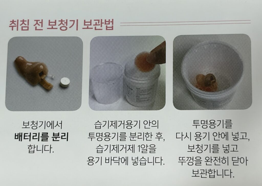 • 해결법: 전용 제습기(습기 제거통)에 보청기를 넣고 2~3시간 정도 바짝 말려보세요. 전자식 제습기를 사용하면 훨씬 빠르게 습기를 제거할 수 있습니다.